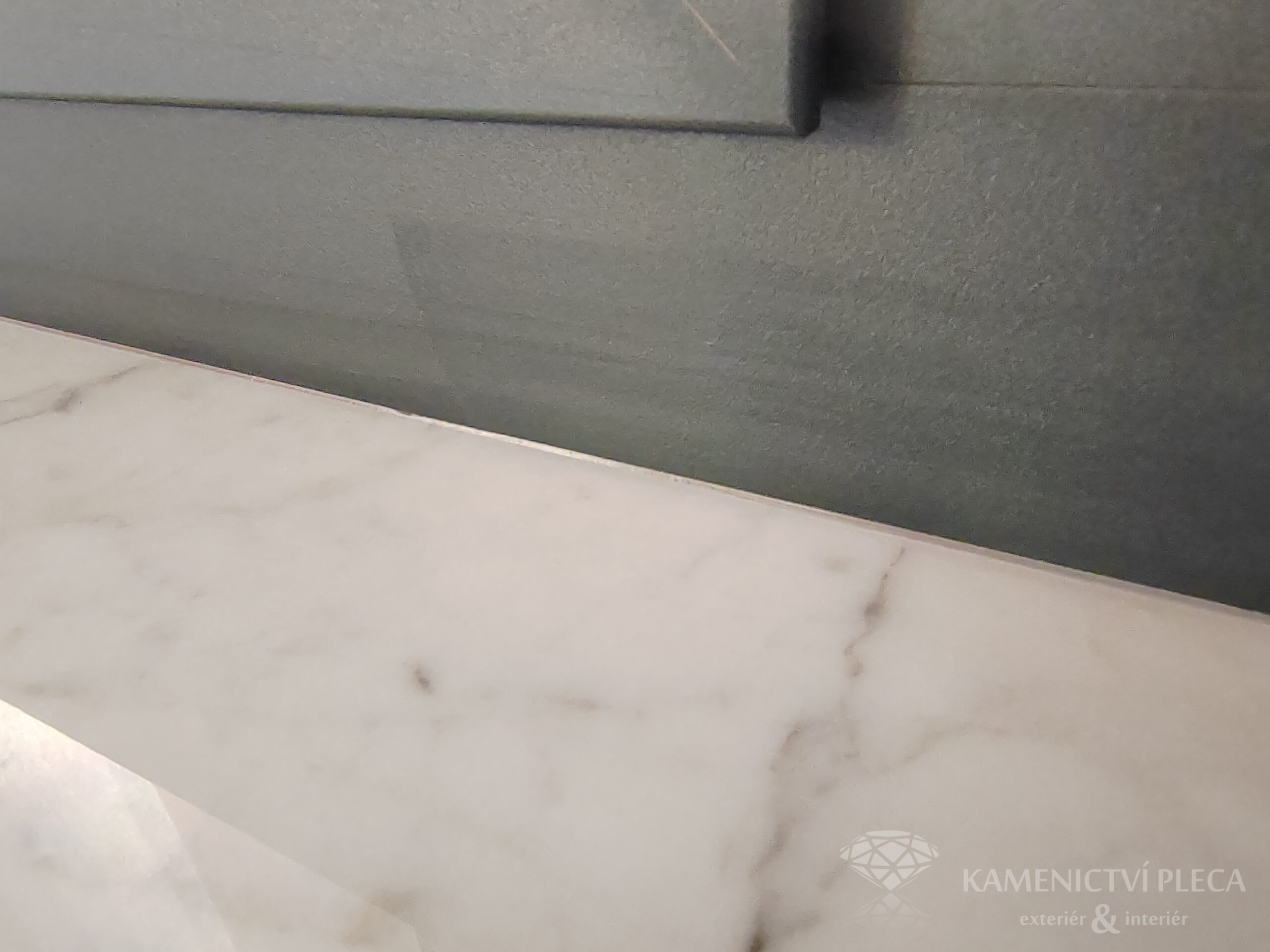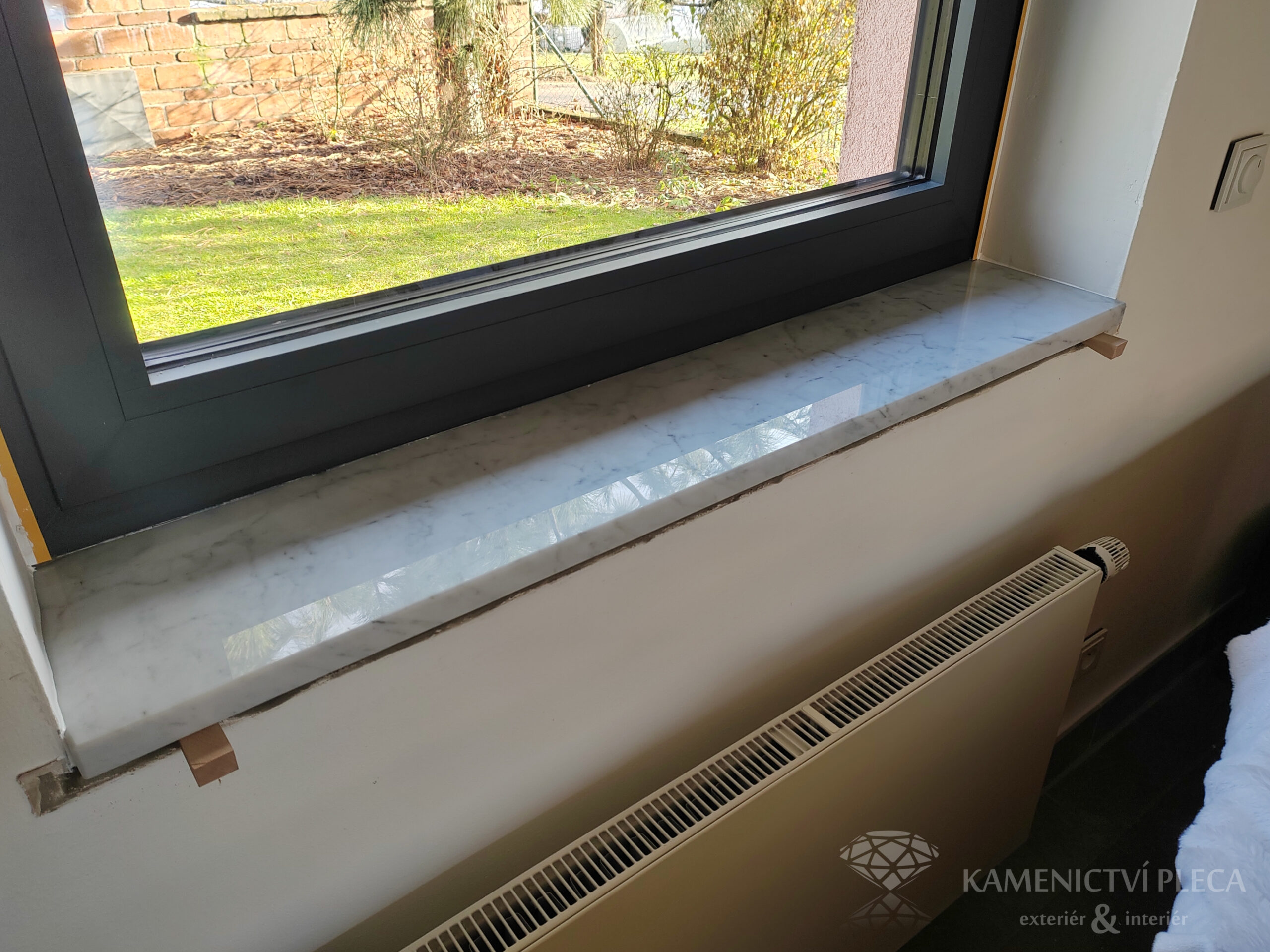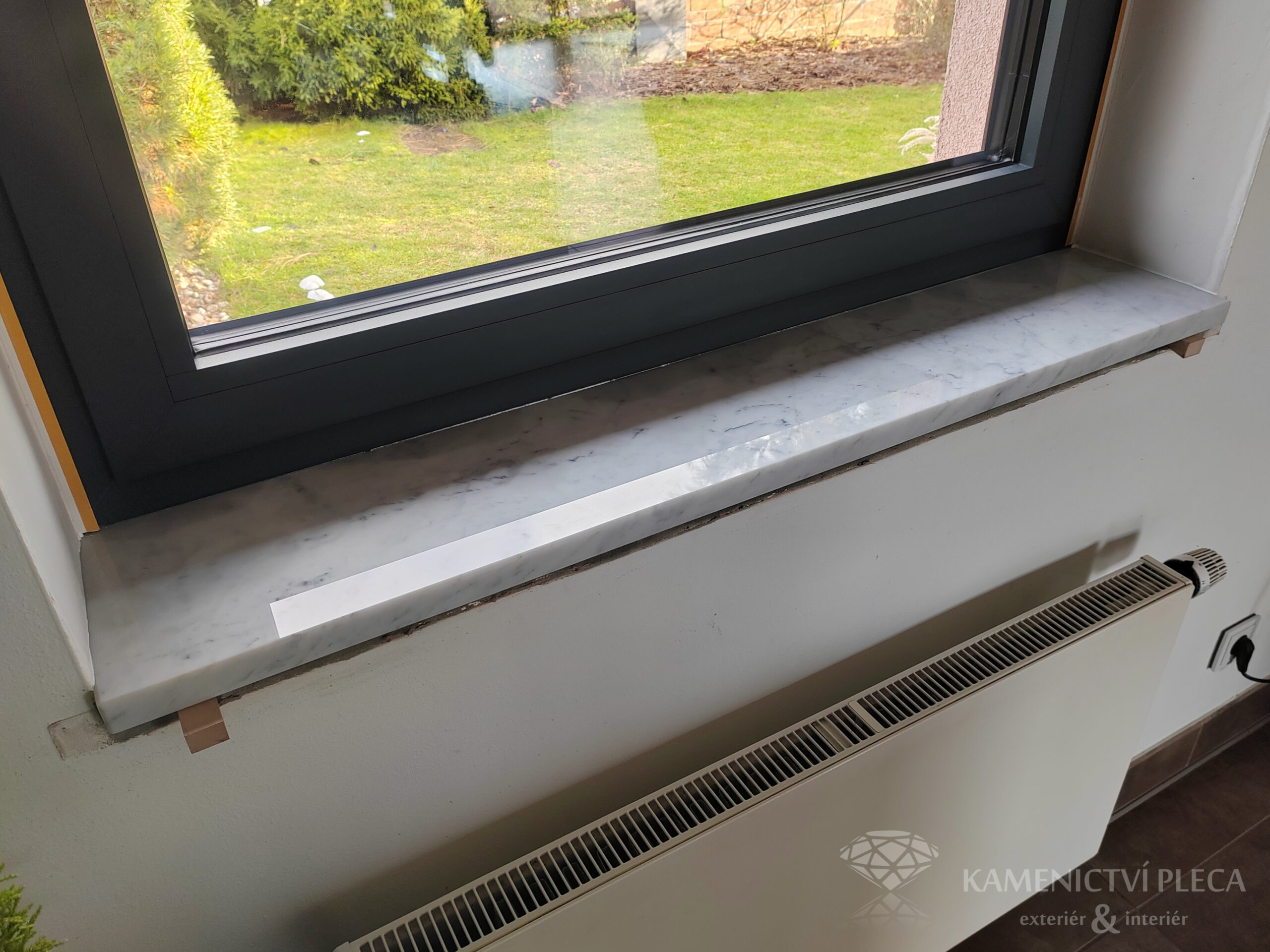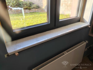 U zákazníků na Hvozdné jsme instalovali mramor Carrara jako parapetní desky. Tento italský mramor vyniká svou krásnou bílou barvou, doplněnou o decentní černošedé mourování. Parapety dodaly antracitovým oknům nádech luxusu a moderního designu. Přírodní kámen zdobí tento velký obývací pokoj.